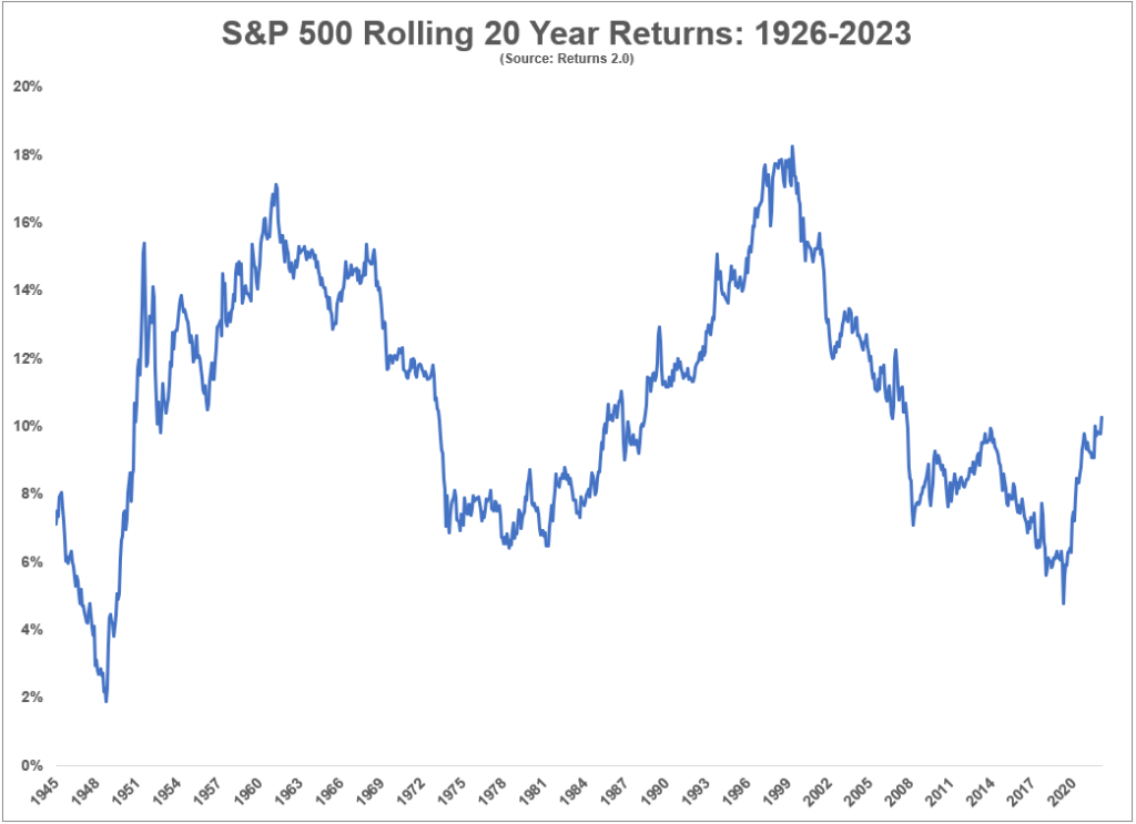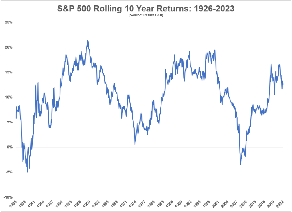 Here are the rolling 10 year returns going all the way back to 1926: