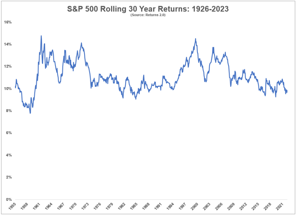 Now for one of my favorite long-run charts — rolling 30 year annual returns: