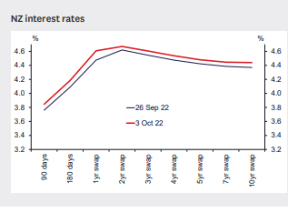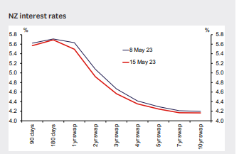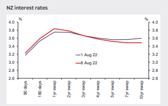 This is the New Zealand swap curve taken from the Westpac weekly economic report (subsequent charts are taken from the same source). Starting from a base of less than 1.5 %, the chart indicates that rates were expected to rise and after two years flatten off.