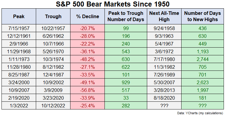 I looked at every bear market going back to 1950 to see how long it has taken for the market to reach new all-time highs from the previous peak.